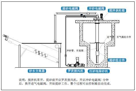 由于葉輪葉漿向上傾斜,旋轉(zhuǎn)時將使池中的污水呈螺旋狀加速,形成渦流態(tài),產(chǎn)生留心力。同時池內(nèi)污水流在葉輪葉片攪拌剪切力的作用下,互相剝離,依靠砂的自身重力和旋流的離心力,使砂粒沿池壁呈螺旋線加速沉降,向中心砂斗積聚,經(jīng)氣提或泵提升后排出池外作進一步的處理。在此過程中,適當(dāng)?shù)臉~角度和線速度條件,使污水中的砂粒受到?jīng)_刷,并保持好的沉降效果,而原來粘附在砂粒上的有機物,以及重量其它小的物質(zhì),隨污水一同流出旋流沉砂池,進入后續(xù)工序繼續(xù)處理,砂與少量污水進入池外砂水分離器內(nèi),砂經(jīng)分離后外排,污水回流至格柵井。